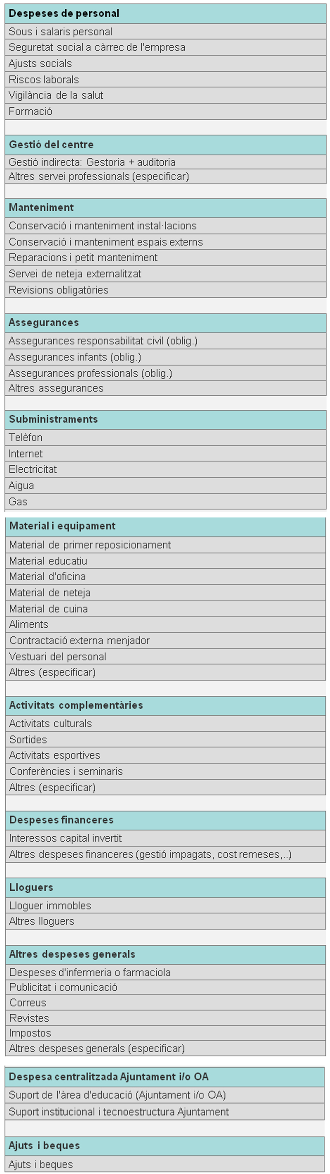 Fes una llista al més exhaustiva possible, tenint en compte aquelles despeses que es troben al pressupost de l'escola bressol, aquelles que s'inclouen en els pressupostos d'altres serveis i aquells costos que no tenen caràcter pressupostari (no són despeses).